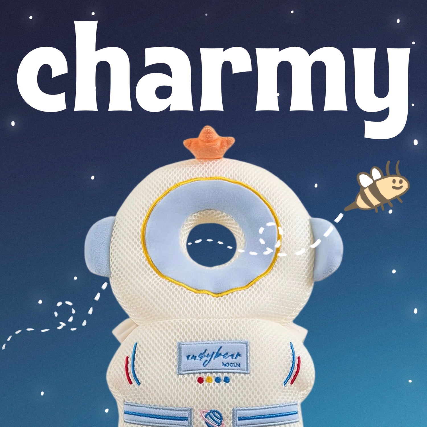 The Charmy backpack-like design to absorb the impact from falls while babies are learning to sit, crawl, and walk. It is designed to cushion the head and back, and is held on by adjustable shoulder and chest straps to fit the baby securely and comfortably.